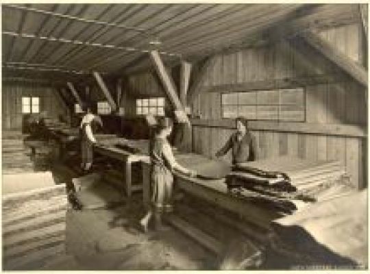 Manufacturing process: The old drying plant is replaced by a new one in which up to 12 wagonloads of cardboard could be dried. The first wood steaming plants were built to enable the manufacture of brown cardboard. Sufficient hydropower was provided by enlarged inflow and outflow channels.